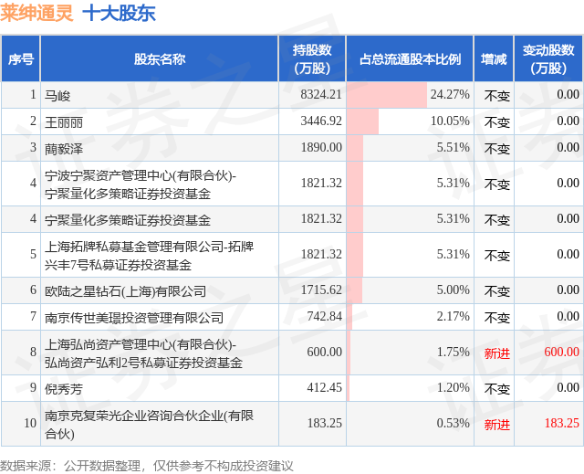 根据莱绅通灵2025年三季报公布的十大股东详情如下:
