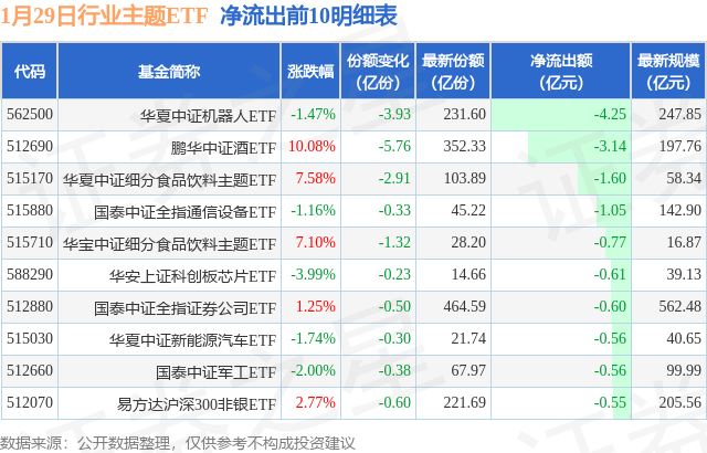 当日有98只行业主题ETF基金出现资金净流出,其中净流出排首位的是华夏中证机器人ETF(562500),份额减少了3.93亿份,净流出额为4.25亿元。