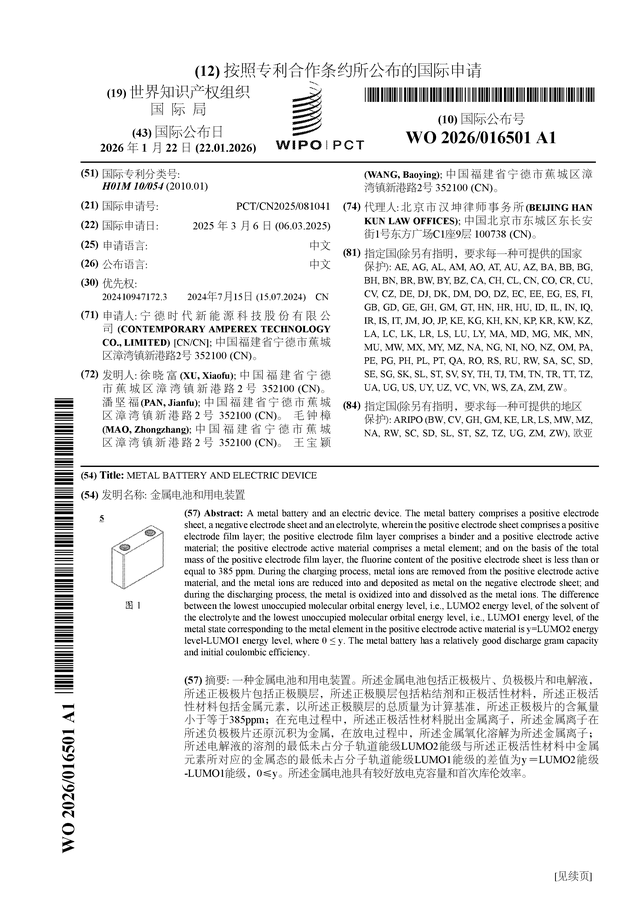 证券之星消息,根据企查查数据显示宁德时代(300750)公布了一项国际专利申请,专利名为“金属电池和用电装置”,专利申请号为PCT/CN2025/081041,国际公布日为2026年1月22日。