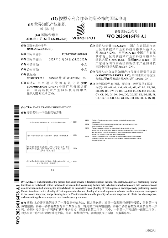 证券之星消息,根据企查查数据显示中兴通讯(000063)公布了一项国际专利申请,专利名为“一种数据传输方法”,专利申请号为PCT/CN2025/078848,国际公布日为2026年1月22日。