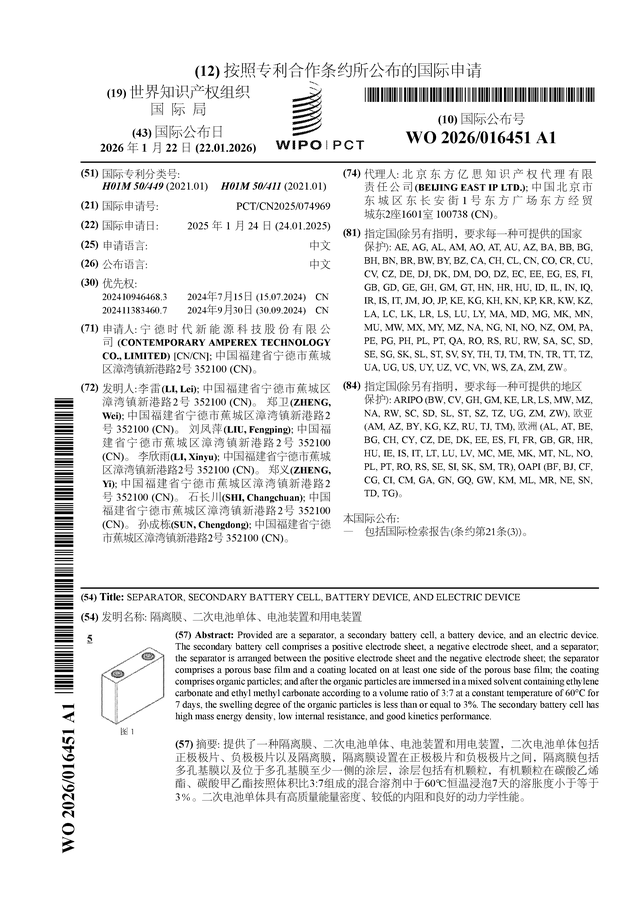 证券之星消息,根据企查查数据显示宁德时代(300750)公布了一项国际专利申请,专利名为“隔离膜、二次电池单体、电池装置和用电装置”,专利申请号为PCT/CN2025/074969,国际公布日为2026年1月22日。