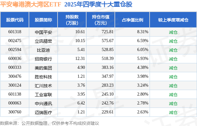平安粤港澳大湾区ETF基金成立于2019年9月23日,基金经理为白圭尧 王郧,基金跟踪标的为中证粤港澳大湾区发展主题指数,成立以来超额回报为27.9%,近一个月超额回报为0.19%。最新披露的基金持仓数据显示,截止2025年12月31日,该基金第一大重仓股为中国平安(601318),持股占比为8.31%。
