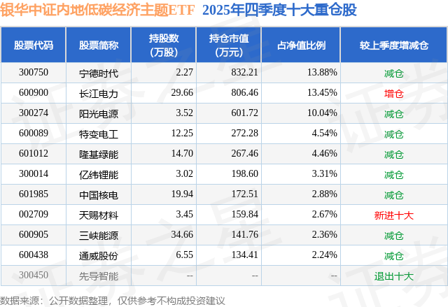 银华中证内地低碳经济主题ETF基金成立于2021年12月20日,基金经理为张亦驰,基金跟踪标的为中证内地低碳经济主题指数,成立以来超额回报为6.67%,近一个月超额回报为-0.09%。最新披露的基金持仓数据显示,截止2025年12月31日,该基金第一大重仓股为宁德时代(300750),持股占比为13.88%。
