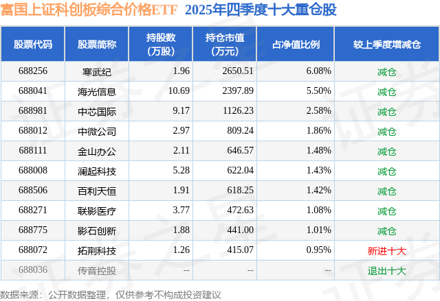 富国上证科创板综合价格ETF基金成立于2025年2月28日,基金经理为金泽宇,基金跟踪标的为上证科创板综合价格指数,成立以来超额回报为3.56%,近一个月超额回报为0.06%。最新披露的基金持仓数据显示,截止2025年12月31日,该基金第一大重仓股为寒武纪(688256),持股占比为6.08%。