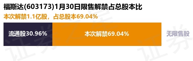 证券之星消息,根据市场公开信息整理,福斯达(603173)于1月30日将有1.1亿股限售股份解禁,为公司首发原股东限售股份,占公司总股本69.04%。(本次数据根据历史公告整理得出,实际情况以上市公司最新公告为准)本次解禁后,公司已无限售股份。具体如下图所示: