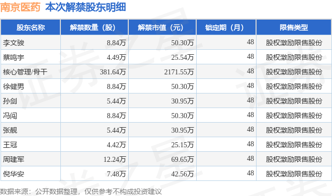 证券之星消息,根据市场公开信息整理,南京医药(600713)于1月30日将有447.67万股限售股份解禁,为公司股权激励限售股份,占公司总股本0.34%。(本次数据根据历史公告整理得出,实际情况以上市公司最新公告为准)最近一年内,该股累计解禁2.56亿股,占总股本的19.56%。本次解禁后,公司还有1909.0万股限售股份,占总股本1.46%。具体如下图所示: