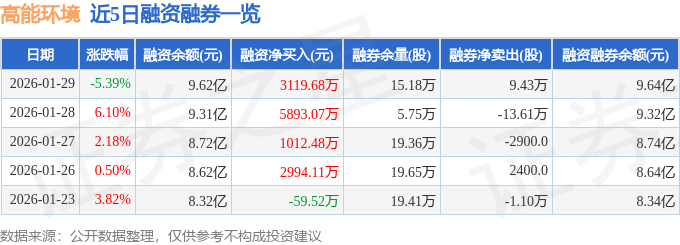 证券之星消息,截至2026年1月29日收盘,高能环境(603588)报收于10.36元,下跌5.39%,换手率6.37%,成交量97.03万手,成交额10.27亿元。