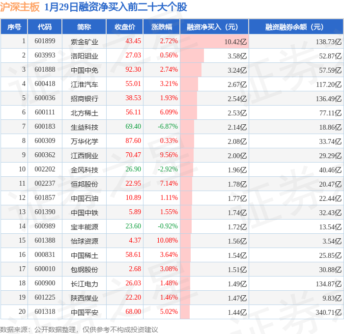 沪深主板融资净买入前三分别为:紫金矿业(601899)融资净买入10.42亿元、洛阳钼业(603993)融资净买入3.58亿元、中国中免(601888)融资净买入3.24亿元,前20具体见下表: