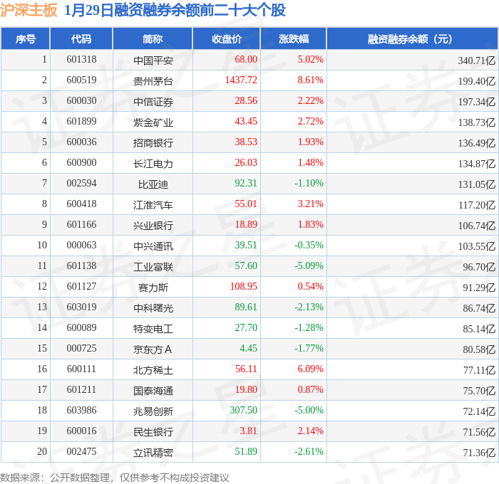 沪深主板融资融券余额前三分别为:中国平安(601318)融资融券余额340.71亿元、贵州茅台(600519)融资融券余额199.4亿元、中信证券(600030)融资融券余额197.34亿元,前20具体见下表: