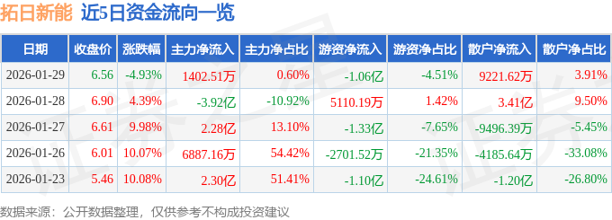 证券之星1月30日盘中消息,9点59分拓日新能(002218)触及跌停板。其所属行业电力目前上涨。领涨股为大连热电。该股为光伏胶膜,BIPV概念,玻璃概念热股。