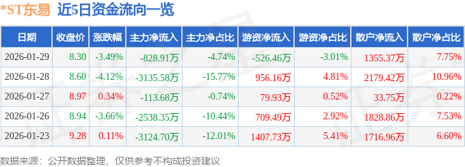 1月29日的资金流向数据方面,主力资金净流出828.91万元,占总成交额4.74%,游资资金净流出526.46万元,占总成交额3.01%,散户资金净流入1355.37万元,占总成交额7.75%。
