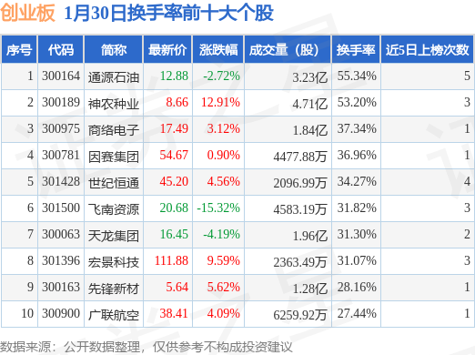 当日创业板换手率前10大个股中7只个股收涨,平均涨幅5.83%,其中通源石油(300164)以换手率55.34%排第一,6只个股近5个交易日中多次上榜。