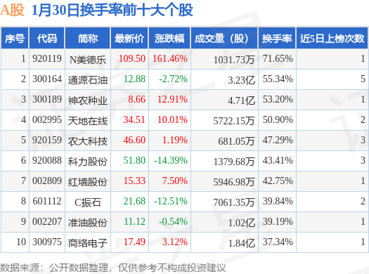 当日A股换手率前10大个股中6只个股收涨,平均涨幅32.7%,其中N美德乐(920119)以换手率71.65%排第一,5只个股近5个交易日中多次上榜。