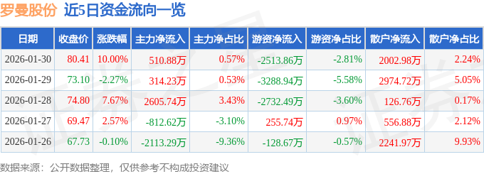 证券之星消息,罗曼股份1月30日涨停收盘,收盘价80.41元。该股于13点42分涨停,6次打开涨停,截止收盘封单资金为1682.18万元,占其流通市值0.19%。