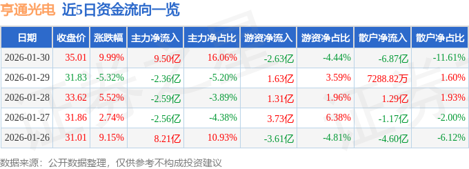 1月30日的资金流向数据方面,主力资金净流入9.5亿元,占总成交额16.06%,游资资金净流出2.63亿元,占总成交额4.44%,散户资金净流出6.87亿元,占总成交额11.61%。