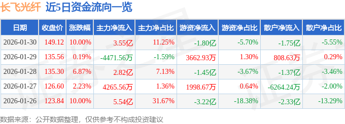 证券之星消息,长飞光纤1月30日涨停收盘,收盘价149.12元。该股于11点15分涨停,未打开涨停,截止收盘封单资金为1.36亿元,占其流通市值0.22%。