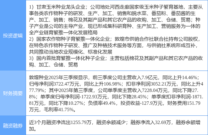 证券之星消息,敦煌种业1月30日涨停收盘,收盘价7.92元。该股于9点41分涨停,6次打开涨停,截止收盘封单资金为3112.0万元,占其流通市值0.74%。