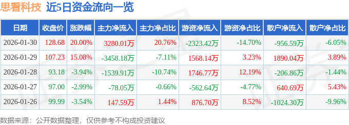 1月30日的资金流向数据方面,主力资金净流入3280.01万元,占总成交额20.76%,游资资金净流出2323.42万元,占总成交额14.7%,散户资金净流出956.59万元,占总成交额6.05%。