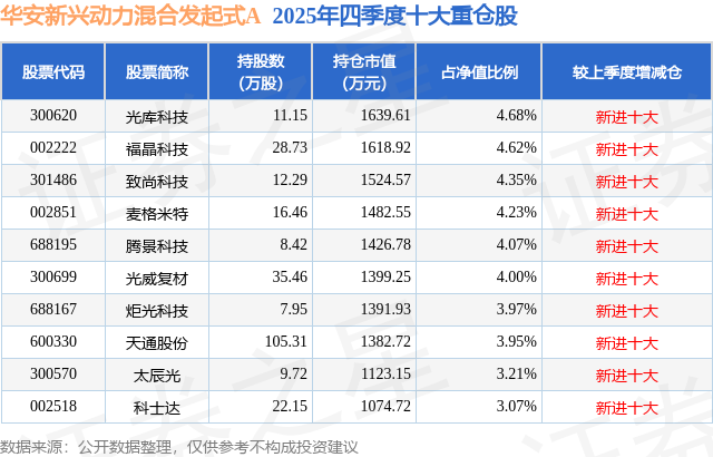 根据2025基金年报公募基金重仓股数据,重仓该股的公募基金共16家,其中持有数量最多的公募基金为华安基金的华安新兴动力混合发起式A。华安新兴动力混合发起式A目前规模为2.6亿元,最新净值1.0508(1月29日),较上一交易日下跌3.49%。该公募基金现任基金经理为许瀚天。许瀚天在任的基金产品包括:华安智联混合(LOF)A,管理时间为2025年5月12日至今,期间收益率为48.17%;华安创新混合,管理时间为2026年1月19日至今,期间收益率为2.5%。