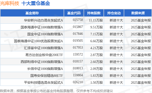 重仓光库科技的前十大公募基金请见下表:
