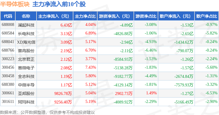 从资金流向上来看,当日半导体板块主力资金净流出34.41亿元,游资资金净流入3.58亿元,散户资金净流入30.83亿元。半导体板块个股资金流向见下表: