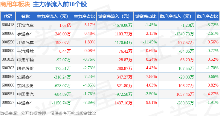 从资金流向上来看,当日商用车板块主力资金净流出2124.15万元,游资资金净流入3541.76万元,散户资金净流出1417.61万元。商用车板块个股资金流向见下表: