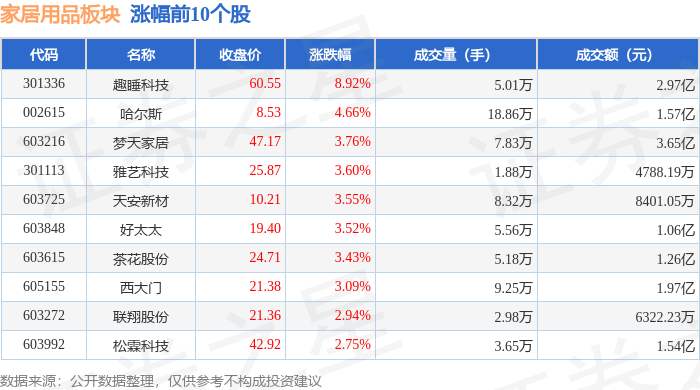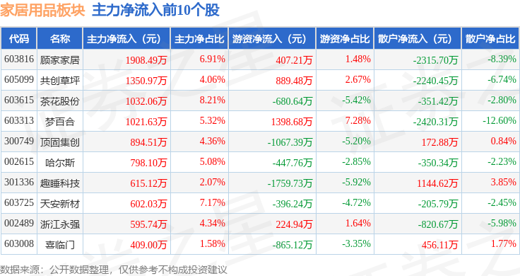 从资金流向上来看,当日家居用品板块主力资金净流出3.15亿元,游资资金净流入1529.97万元,散户资金净流入2.99亿元。家居用品板块个股资金流向见下表: