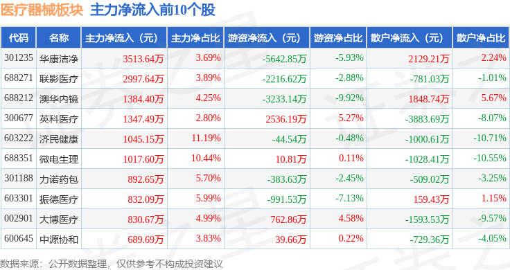 从资金流向上来看,当日医疗器械板块主力资金净流出7.5亿元,游资资金净流入9981.49万元,散户资金净流入6.5亿元。医疗器械板块个股资金流向见下表: