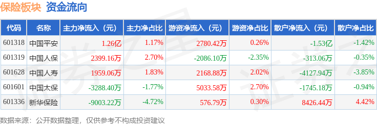 从资金流向上来看,当日保险板块主力资金净流入4628.43万元,游资资金净流入8473.58万元,散户资金净流出1.31亿元。保险板块个股资金流向见下表: