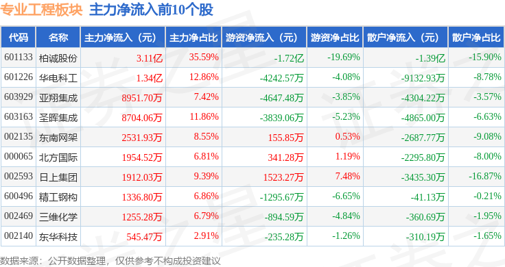 从资金流向上来看,当日专业工程板块主力资金净流出1.23亿元,游资资金净流出2.47亿元,散户资金净流入3.7亿元。专业工程板块个股资金流向见下表: