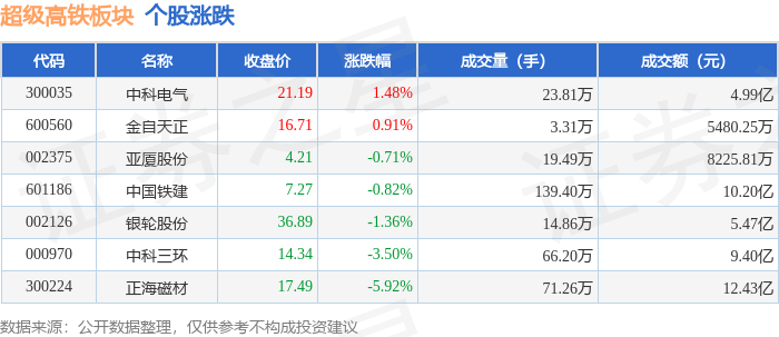 证券之星消息,1月30日超级高铁板块较上一交易日下跌1.51%,正海磁材领跌。当日上证指数报收于4117.95,下跌0.96%。深证成指报收于14205.89,下跌0.66%。超级高铁板块个股涨跌见下表: