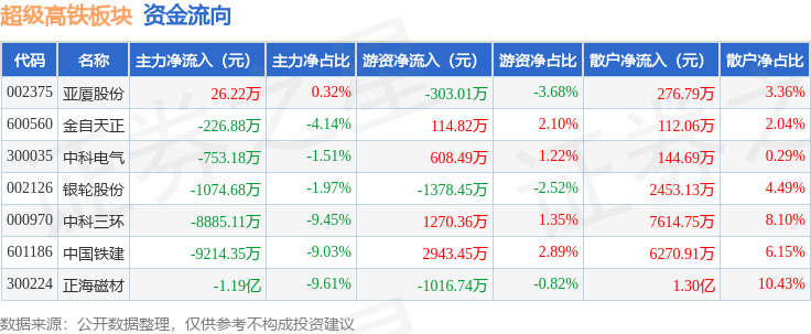 从资金流向上来看,当日超级高铁板块主力资金净流出3.21亿元,游资资金净流入2238.91万元,散户资金净流入2.98亿元。超级高铁板块个股资金流向见下表: