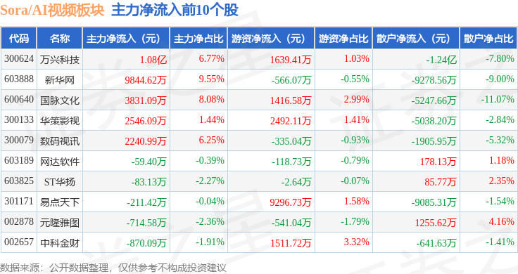 从资金流向上来看,当日Sora/AI视频板块主力资金净流出25.24亿元,游资资金净流入12.62亿元,散户资金净流入12.62亿元。Sora/AI视频板块个股资金流向见下表: