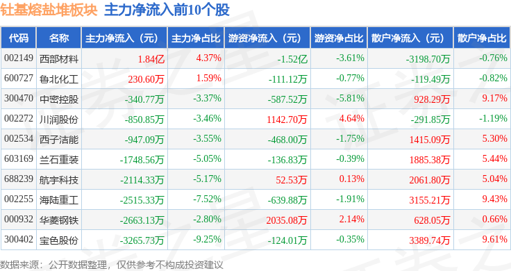 从资金流向上来看,当日钍基熔盐堆板块主力资金净流出23.93亿元,游资资金净流入5.56亿元,散户资金净流入18.37亿元。钍基熔盐堆板块个股资金流向见下表: