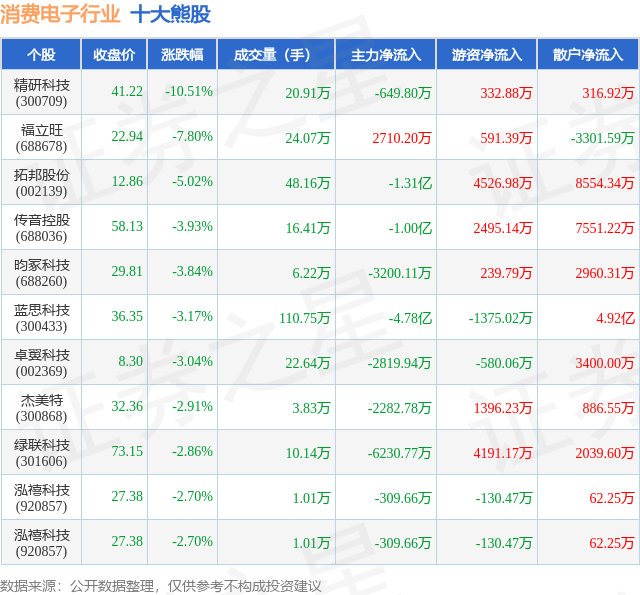 个股表现方面,消费电子行业当日领跌股为精研科技(300709),该股当日报收41.22,下跌10.51%,成交量20.91万,主力资金净流出649.8万元。福立旺(688678)以下跌7.8%紧随其后,该股当日成交量24.07万,主力资金净流入2710.2万元。除此之外,拓邦股份(002139)、传音控股(688036)、昀冢科技(688260)均进入当日熊股之列。具体个股列表见下表: