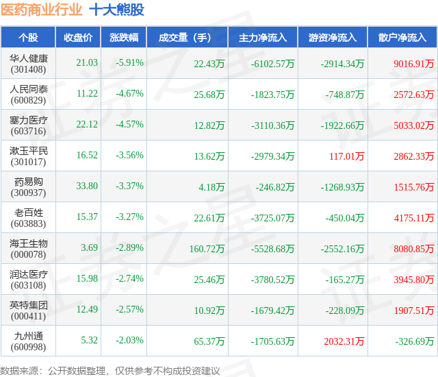 个股表现方面,医药商业行业当日领跌股为华人健康(301408),该股当日报收21.03,下跌5.91%,成交量22.43万,主力资金净流出6102.57万元。人民同泰(600829)以下跌4.67%紧随其后,该股当日成交量25.68万,主力资金净流出1823.75万元。除此之外,塞力医疗(603716)、漱玉平民(301017)、药易购(300937)均进入当日熊股之列。具体个股列表见下表: