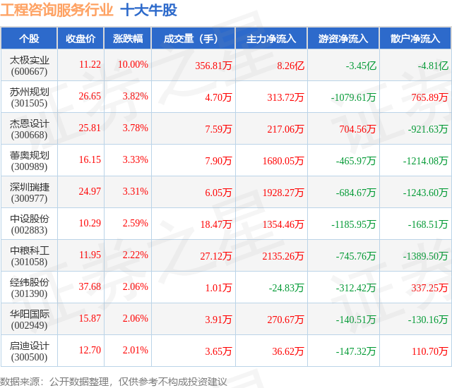 个股表现方面,工程咨询服务行业当日领涨股为太极实业(600667),该股当日报收11.22,上涨10.0%,成交量356.81万,主力资金净流入8.26亿元。苏州规划(301505)以上涨3.82%紧随其后,该股当日成交量4.7万,主力资金净流入313.72万元。除此之外,杰恩设计(300668)、蕾奥规划(300989)、深圳瑞捷(300977)均进入当日牛股之列。具体个股列表见下表: