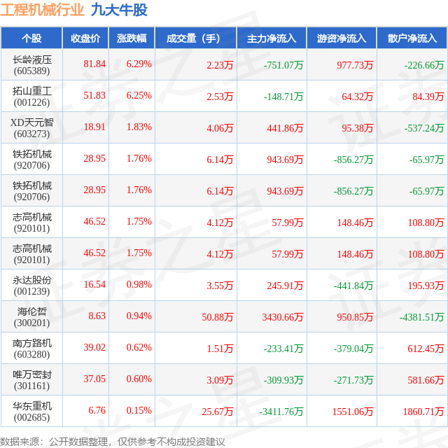 个股表现方面,工程机械行业当日领涨股为长龄液压(605389),该股当日报收81.84,上涨6.29%,成交量2.23万,主力资金净流出751.07万元。拓山重工(001226)以上涨6.25%紧随其后,该股当日成交量2.53万,主力资金净流出148.71万元。除此之外,XD天元智(603273)、铁拓机械(920706)、铁拓机械(920706)均进入当日牛股之列。具体个股列表见下表: