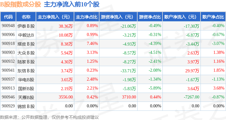 资金流向方面,B股指数(000003)成份股当日主力资金净流出合计51.22万元,游资资金净流出合计373.1万元,散户资金净流入合计424.33万元。成份股资金流向详情见下表: