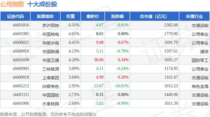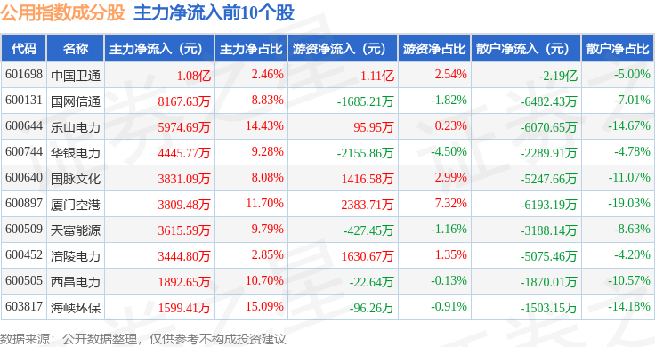 资金流向方面,公用指数(000007)成份股当日主力资金净流出合计30.96亿元,游资资金净流入合计10.99亿元,散户资金净流入合计19.98亿元。成份股资金流向详情见下表: