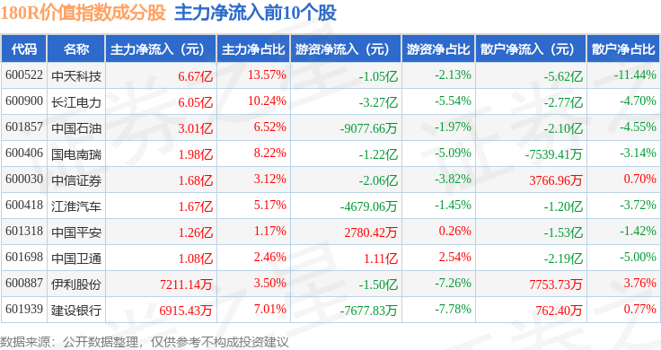 资金流向方面,180R价值(000031)指数成份股当日主力资金净流出合计101.38亿元,游资资金净流入合计27.48亿元,散户资金净流入合计73.91亿元。成份股资金流向详情见下表: