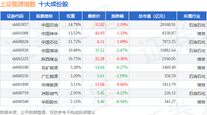 上证能源(000032)指数十大成份股详情如下: