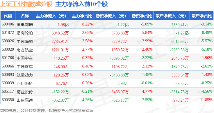资金流向方面,上证工业(000034)指数成份股当日主力资金净流出合计58.76亿元,游资资金净流入合计11.38亿元,散户资金净流入合计47.39亿元。成份股资金流向详情见下表: