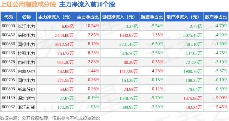 资金流向方面,上证公用(000041)指数成份股当日主力资金净流出合计1.94亿元,游资资金净流出合计1.44亿元,散户资金净流入合计3.37亿元。成份股资金流向详情见下表: