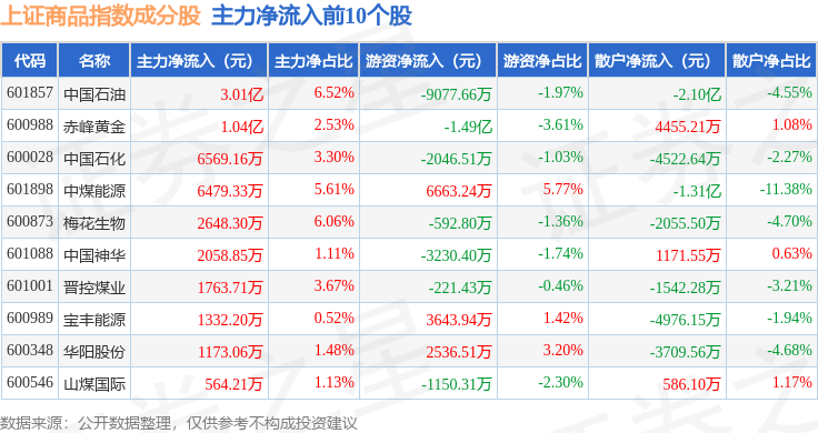 资金流向方面,上证商品(000066)指数成份股当日主力资金净流出合计122.56亿元,游资资金净流入合计28.43亿元,散户资金净流入合计94.12亿元。成份股资金流向详情见下表: