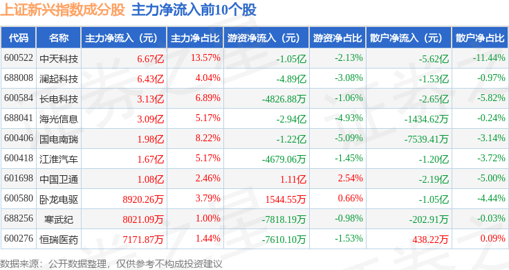 资金流向方面,上证新兴(000067)指数成份股当日主力资金净流出合计57.19亿元,游资资金净流入合计14.08亿元,散户资金净流入合计43.11亿元。成份股资金流向详情见下表: