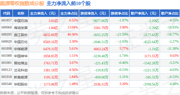 资金流向方面,能源等权(000070)指数成份股当日主力资金净流出合计15.02亿元,游资资金净流入合计5.25亿元,散户资金净流入合计9.78亿元。成份股资金流向详情见下表:
