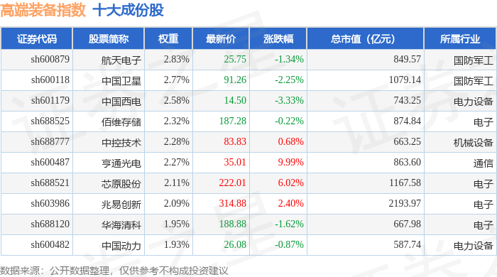 高端装备(000097)指数十大成份股详情如下: