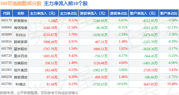 资金流向方面,380可选(000107)指数成份股当日主力资金净流出合计13.55亿元,游资资金净流入合计2.26亿元,散户资金净流入合计11.29亿元。成份股资金流向详情见下表: