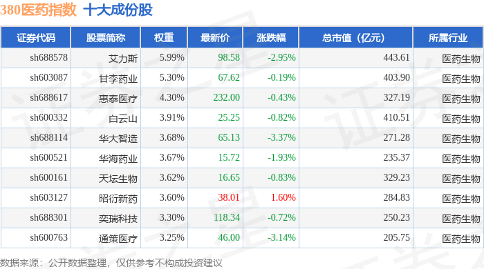 380医药(000109)指数十大成份股详情如下: